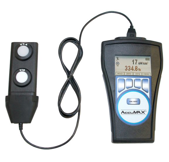 The AccuMAX™ XRP-3000 radiometer/photometer kit uses a dualwavelength UV-A/VIS sensor detector to measure both ultraviolet and visible light. Featuring automatic zeroing, integration and signal hold, the unit provides accurate readouts for UV, visible irradiance or radiance. The LCD readout features ±0.2% linearity with the sensor sending the linearity correction data to the readout unit during initial power up. To ensure consistent results, sensors are designed with superior bandpass filters while optical stacks are assembled in Class 100 clean workstations. For precise spectral coverage, high-quality interference filters are used to resist degradation.