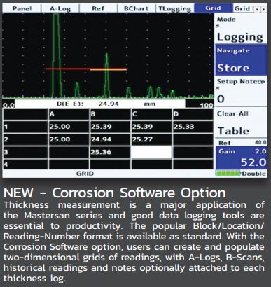 - 腐蚀软件(选项)(包括B-Scan) -允许使用车载UTility软件从PC上传复杂的检查计划。其功能包括二维厚度记录、存储带有厚度值的a - log和b - log、对每个位置进行多次读数并为每个网格位置创建记录。b -扫描选项可用来显示条形图视图的厚度读数通过门1对距离或时间。