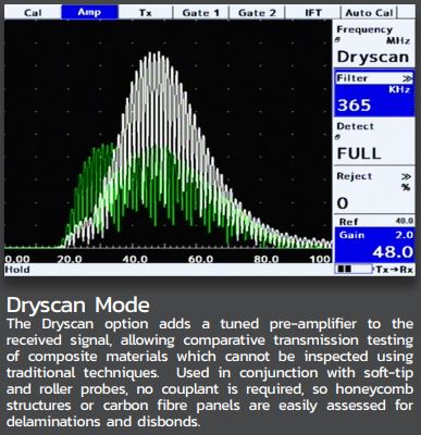- Dryscan功能(选项)-调谐低频前置放大器,用于干耦合技术,如复合材料中的粘结检查和分层。