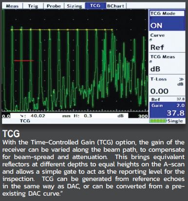 - TCG(选项)-时间校正或“扫频”增益,由最多20个参考点定义或从DAC曲线转换。所有点转换为屏幕高度的80%。